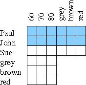 Optional: attempt a Boolean logic solution (which may be more difficult than a solution with pen and paper). In Boolean logic each of the blue coloured squares in the grid needs to become a variable ("p60: Paul weighs 60", "p70: Paul weighs 70", etc). How many rows does a truthtable with 12 variables have?